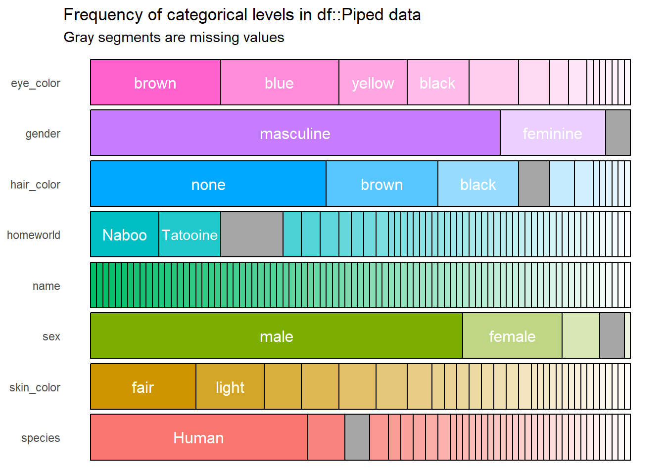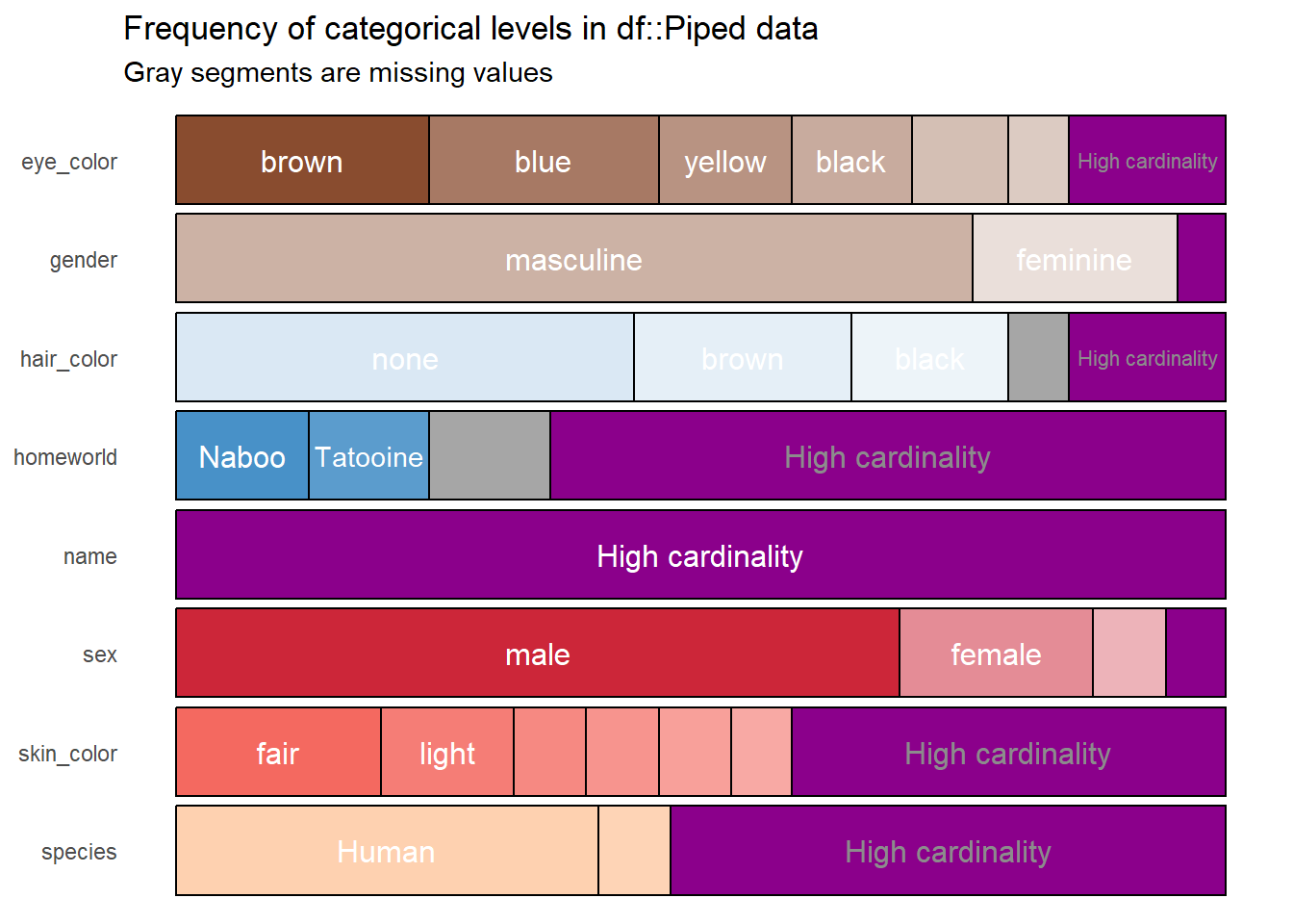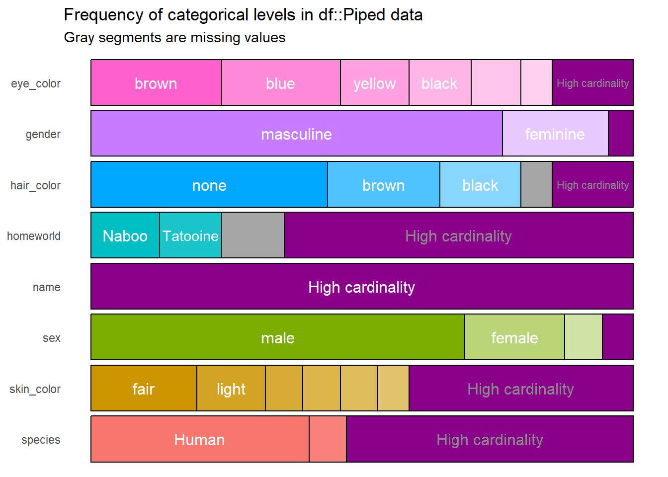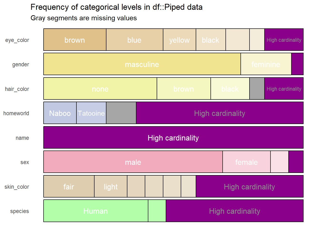 Este resultado contiene la misma información que el objeto df, pero ahora es más fácil, rápido e incluso agradable para interpretar. Sin embargo, este resultado puede mejorar, pues por ejemplo la variable name no sirve de mucho en el gráfico porque todos los nombres son diferentes. Esto se puede solucionar modificando el argumento high_cardinality, lo cual hace que únicamente se grafiquen todas aquellas categorías que aparezcan un determinado número de veces, digamos cuatro.